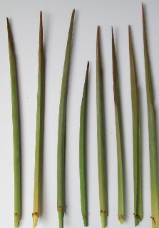 Dwarf Double Palm Frond Strips(left) vary in size from 11" to 18" and are stripped from dwarf branches . They are packaged in bunches of a 100 strips and are ready to hand out when you receive them. One bunch is enough for 100 people and cost $24.49 each code DS
